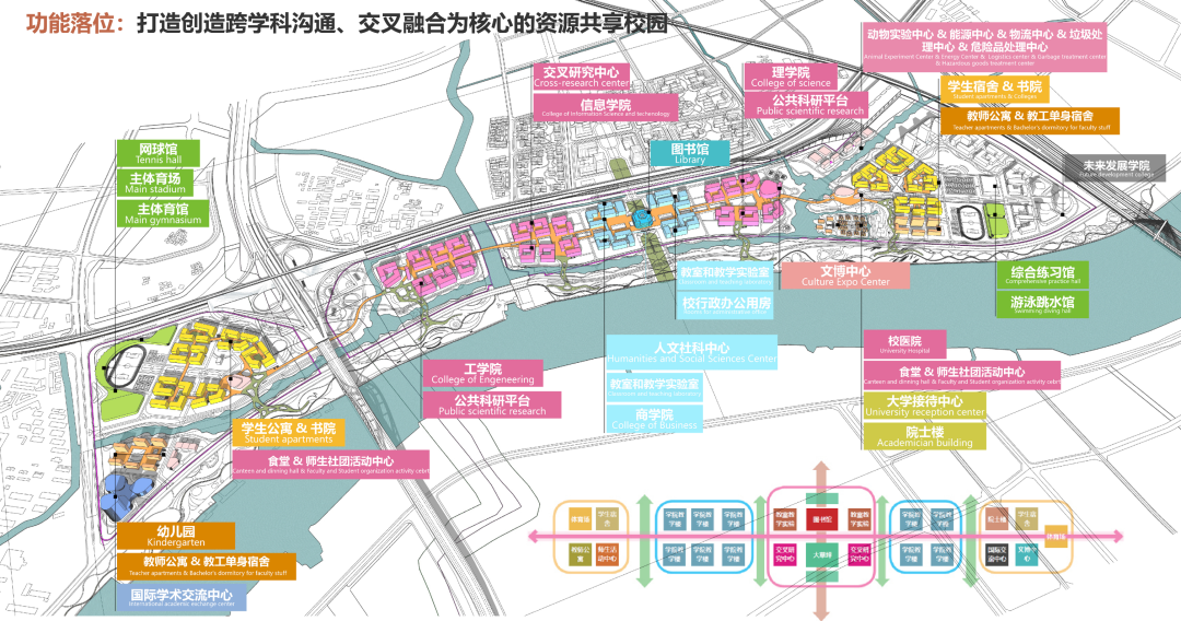 中心区左翼(西侧)规划有主体育馆、学术交流区、社团活动区和宿舍。