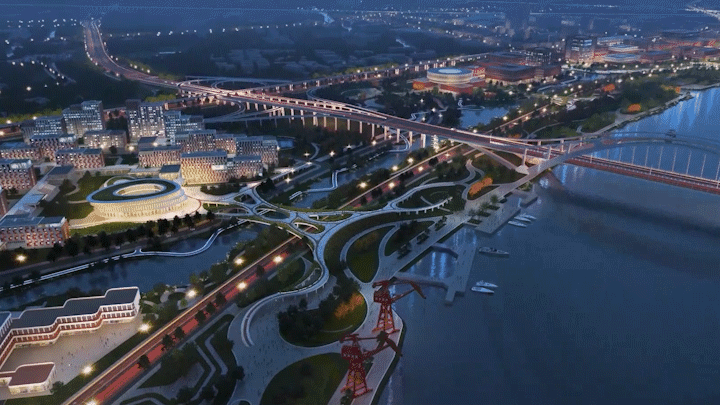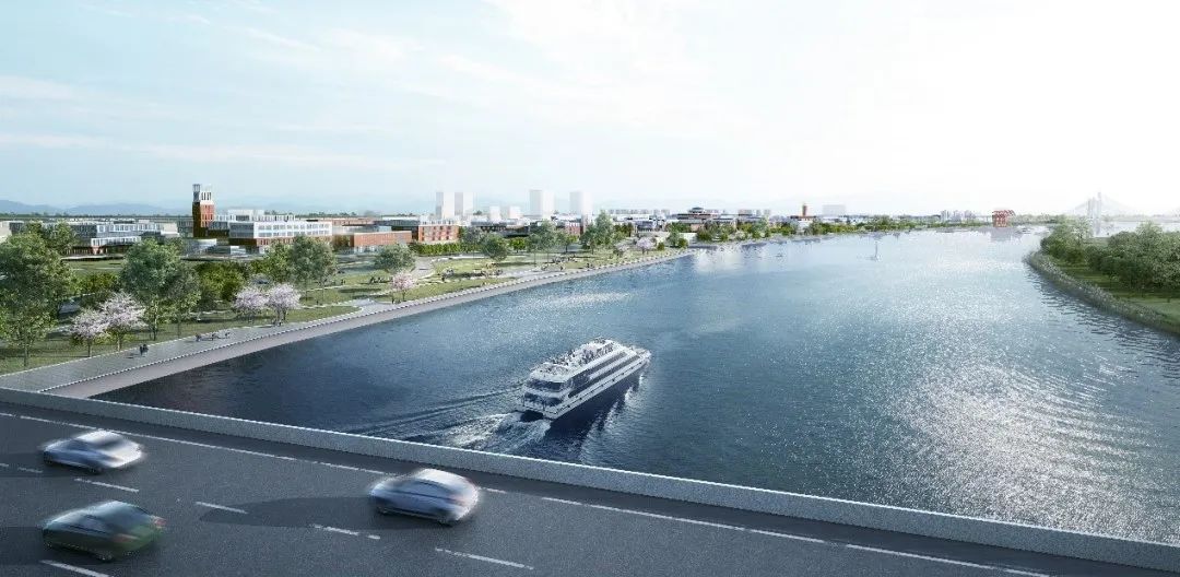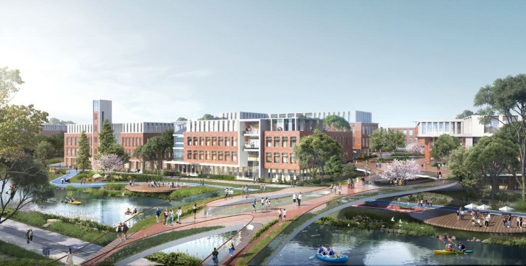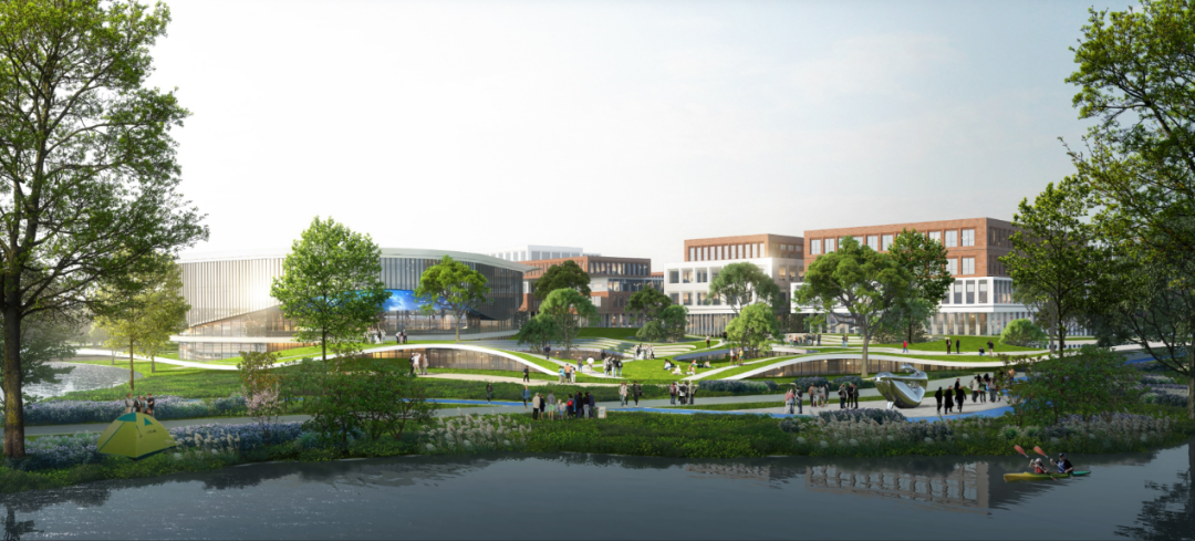 依江而建的校园,在中轴对称的基础上做到了新的突破,以甬江为纽带自然构建城市新的滨江区,以曲线链接天然与未来相融合的校园,借此提升学生体验,强化学生、校园与当地母亲河甬江之间的联系。