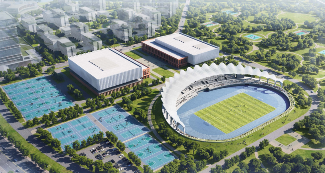 中心区右翼(东侧)规划有综合运动馆、文博中心、校医院和宿舍等。