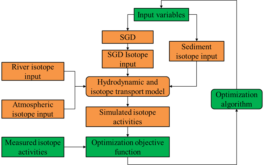 海底地下水排泄(Submarine Groundwater Discharge, SGD)是陆海界面重要的水文过程,对海洋生态系统的健康至关重要。传统的SGD估算方法源自1996年Moore提出的同位素质量平衡区域箱型模型,其准确度受限于各源汇项的计算精度,且难以考虑海洋水流的动态变化影响和SGD的空间异质性。郑春苗研究团队提出了一种基于模拟-优化框架的估算SGD的新方法(图1)。该方法用海洋水动力模型FVCOM模拟同位素在海洋中的迁移过程,将SGD的同位素输入作为边界条件,用优化算法DYCORS估算空间变化的SGD。该研究方法代表着自1996年以来SGD估算的重大进展,可同时考虑海洋水动力过程的影响和SGD的空间异质性,为更详细地估算SGD提供了新的强大工具。