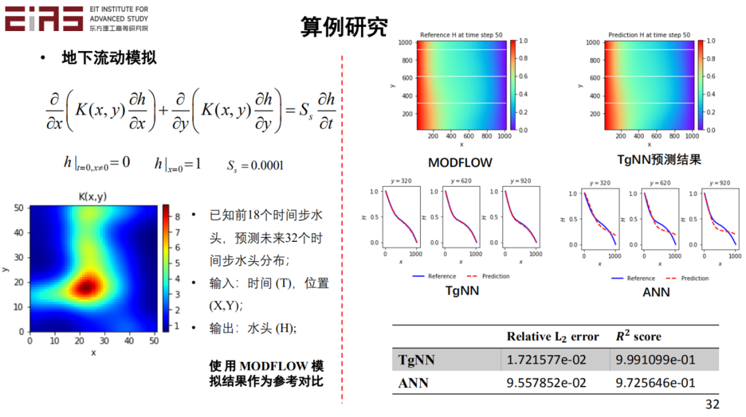 下面我们通过一系列的例子说明这个问题。比如地下水流动的问题,假设我们有最开始一段时间的数据,但是在后面改变了边界条件,即情景发生了很大变化,且没有后面一段时间的观测数据,那么常规的数据驱动模型是无法解决的。但是如果知道边界条件和控制方程,结合最开始时间的数据,就可以进行预测,且实际效果很好,如图中的对比结果。由于流场的条件已经改变了,所以开始一段时间的观测数据的数据分布已经与后一段时间不一致了,但是两段时间的数据都是受到同样的控制方程约束的,因此,如果直接用数据驱动模型预测,就会有较大误差。但是如果加入领域知识,比如控制方程和边界条件,就会有效提升模型的精度。在这个问题中,控制方程和边界条件起了很大的作用。