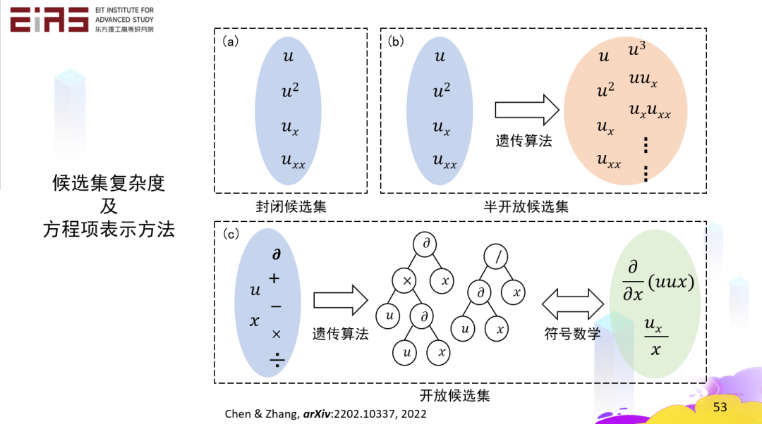 后来我们做的时候发现,实际上我们不一定知道哪项是真正有用的。这种情况下,我们给一些基本的项,其他的项,我们通过遗传算法的交叉和变异得到新的项,这叫做半开放候选集。虽然我们没有一个完备的候选集,但是我们也能解决这个问题。当然,现在更好的办法是,如果只给我一个自变量,给我一个因变量,我们再定义一些运算符、运算法则。这种情况下,如果我们能够定义像导数,加减,乘除等等这些运算符,那么方程的每一项都是一个树的结构,这样你通过一次次变异去改变树的结构,就可以把方程找出来。即使是比较复杂的方程也能找出来,而且只需要自变量和因变量。