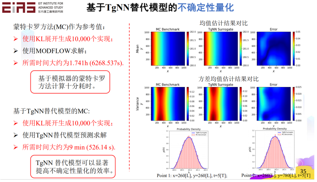 这个方法在不确定性量化问题中具有优势。常规的方法,比如蒙特卡罗方法,处理不确定性量化时需要生成多个实现,所以需要很长的时间解不同实现中的方程。但是如果用这种替代模型,因为神经网络的预测速度很快,基本上每个情景直接可以条件反射一般地生成结果,就可以非常高效地实现不确定性量化。