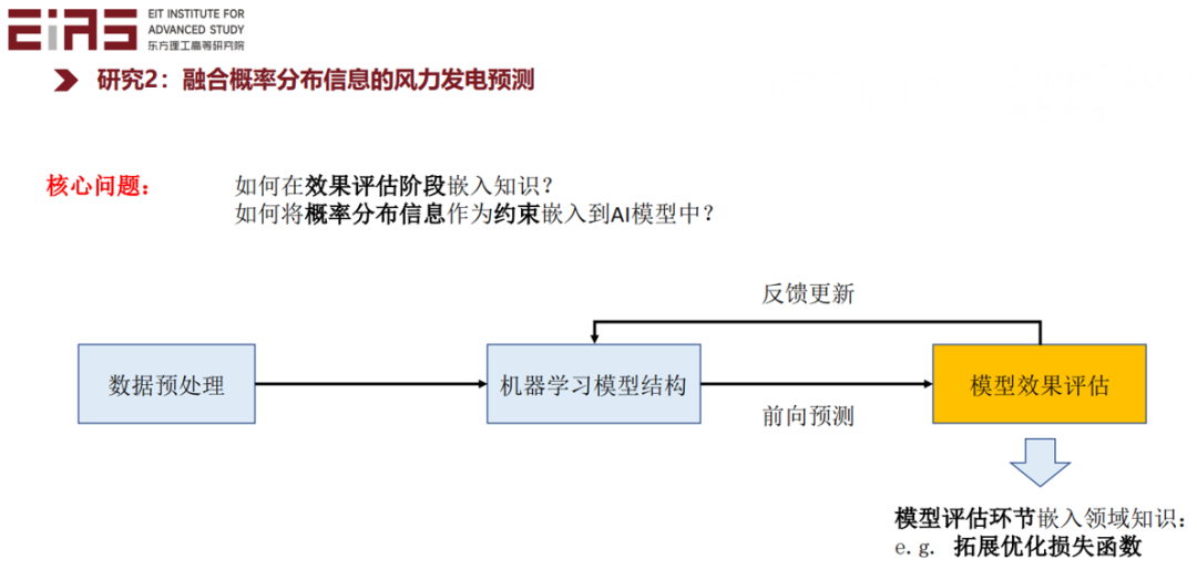 另外在模型的效果评估阶段也可以嵌入知识。比如在风力发电问题中,我们将概率分布所蕴含的信息作为约束,嵌入到数据驱动模型中,从而借助先验的概率密度函数拓展优化损失函数。