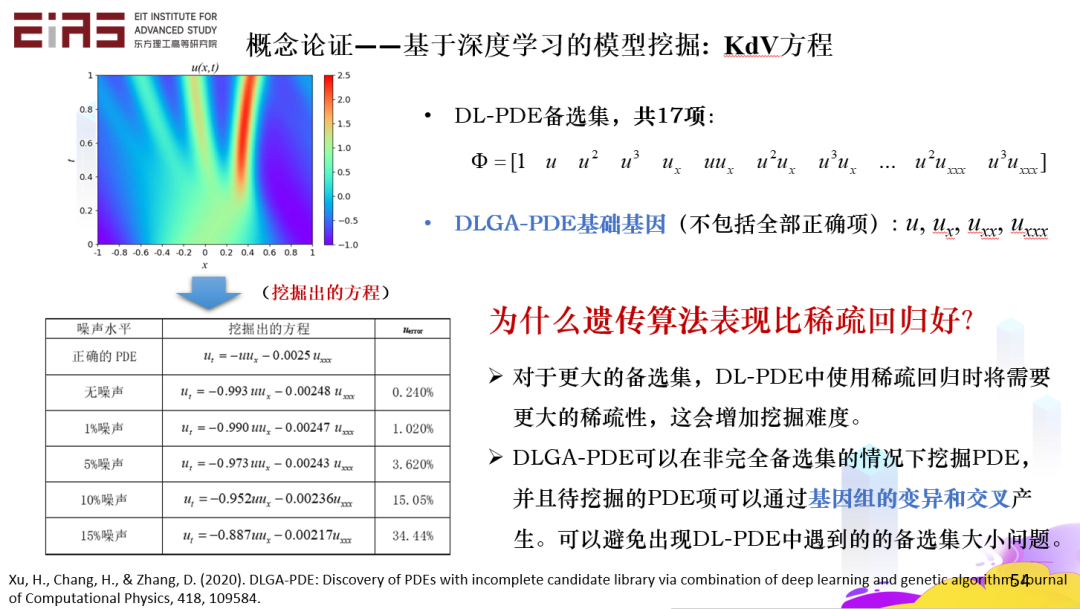 我们举个例子,KdV 方程,一个很复杂的方程。对于封闭候选集,需要先猜测这里面大概会包含哪些项?在这里,我们假设这里面有 17 项,而且方程真正需要的项确实也在这里面,这种情况下是能把问题解出来的。如果像刚才讲的半开放候选集,虽然只给了四个项,真正的项以及其他很多项不在这个候选集里面,这种情况下怎么办?可以通过交叉和变异的算法,产生新的项,这样也能把这个问题解决。