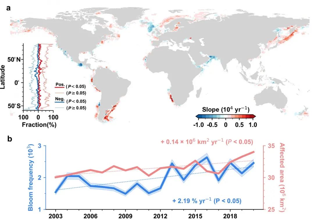 图3. 2003年至2020年间,全球海岸带浮游植物藻华变化趋势。a:全球1°×1°格网尺度下藻华频率变化趋势的空间分布;b:藻华频率年中值和全球藻华总面积的年际变化和趋势。