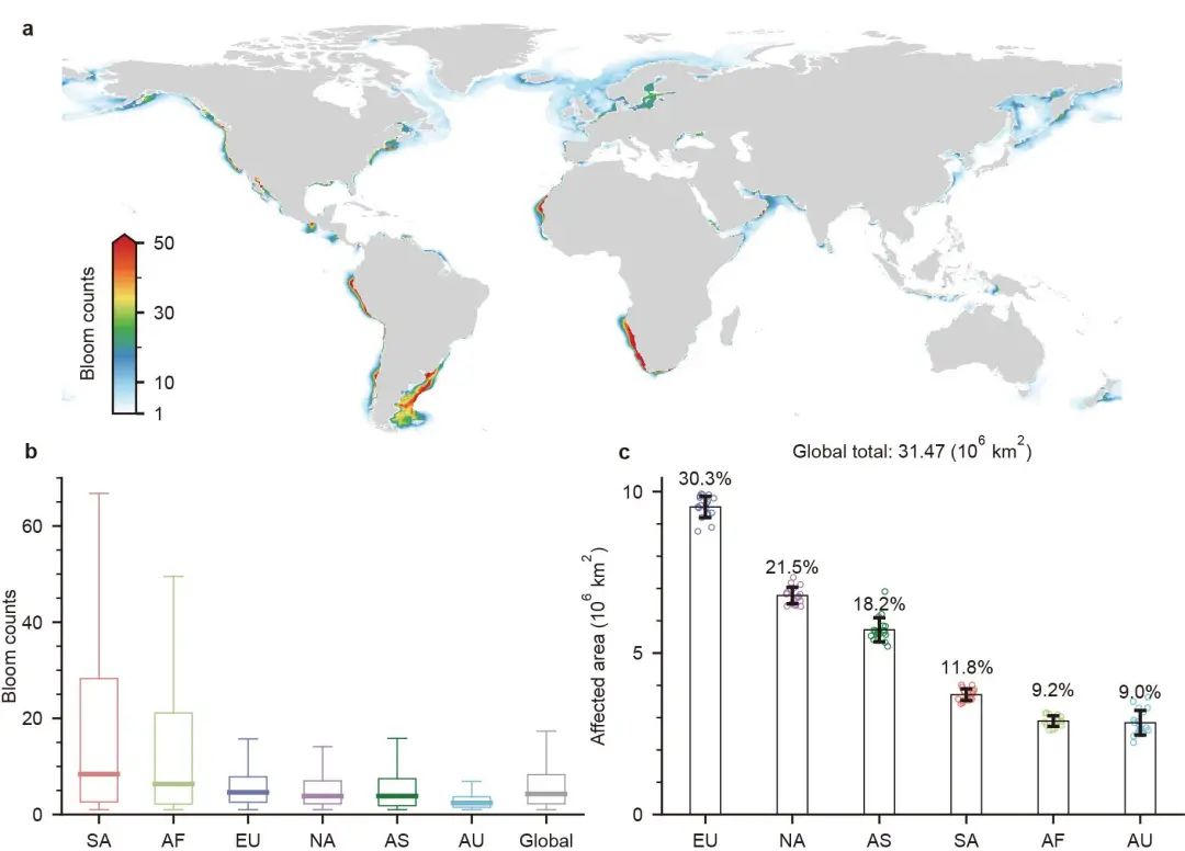 图2. 2003~2020年间,全球海岸带浮游植物藻华分布图。a:基于MODIS Aqua遥感日尺度观测数据的全球年平均藻华发生次数空间分布图;b:基于全球和各大洲的藻华发生次数统计结果(SA:南美洲,AF:非洲,EU:欧洲,NA:北美洲,AS:亚洲,AU:澳大利亚);c:各大洲受藻华影响面积的多年平均统计结果。其中,百分比数字表示各大洲藻华面积在全球的占比。
