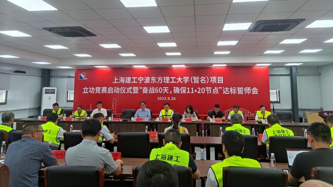 9月26日,宁波东方理工大学项目指挥部召开立功竞赛启动仪式暨“奋战60天,确保11·20节点”达标誓师会。宁波东方理工大学副校长何亦武,宁波市镇海区建交局党委委员黄开聪,上海建工集团副总裁、项目总指挥王志刚出席会议并发表讲话。虞仁荣教育基金会、我校校园规划与建设部、华润代建、江南管理浙东分公等单位分管领导及项目相关人员参加会议。