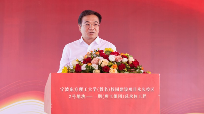 宁波东方理工大学副校长何亦武宣布开工,现场机械设备启动、放礼炮。