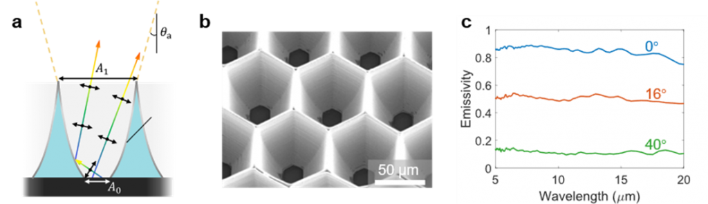 为解决以上问题,黄子劲团队开发了一种基于非成像光学原理的定向微型热发射器:由于光学扩展量(光束占据的面积与立体角之积)守恒,热辐射从发射器底部抵达顶部时占据的面积增大,角度范围因此缩小,产生方向性。这一过程不依赖于任何振动或传输模式,所以该发射器通用于不同偏振和波长。该发射器的单元被设计为正六边形,以获得高对称性并实现密铺,有利于高效地传输热辐射。研究团队通过以双光子3D光刻为核心的微纳加工流程,制备了具有高结构质量的微型定向发射器阵列。光谱测试验证了该发射器优异的方向性,并实现了超宽的波长覆盖范围(5-20 μm),远超过往工作。