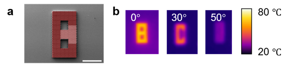 在上述的微型定向发射器阵列中,每个六边形单元都可以充当一个用于红外显示的像素。在此基础上,研究团队发明了一种新型定向红外显示器。通过组合具有不同发射角宽度的微型发射器,使得热像仪从不同方向观察该阵列时会拍摄到不同的图案,以此实现红外信息的伪装。
