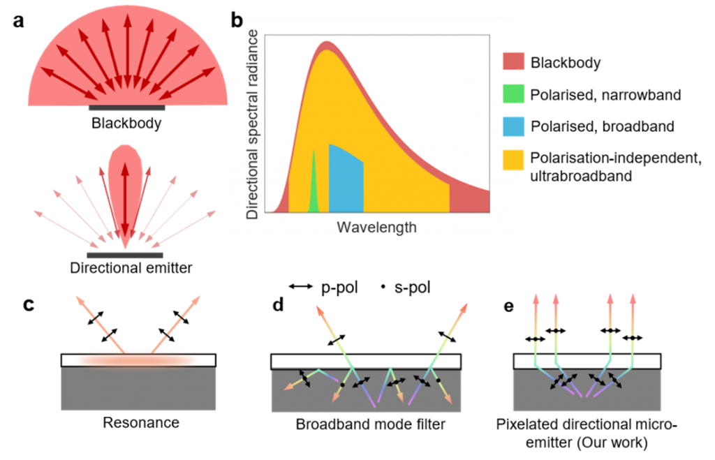 这种像素化的非成像微型发射器首次实现了利用微纳结构对全偏振的宽带热辐射进行方向控制,能有效促进辐射冷却、红外光谱分析、热光伏及热伪装等技术的进步,为能源、传感和成像等领域的发展提供了新的视角。