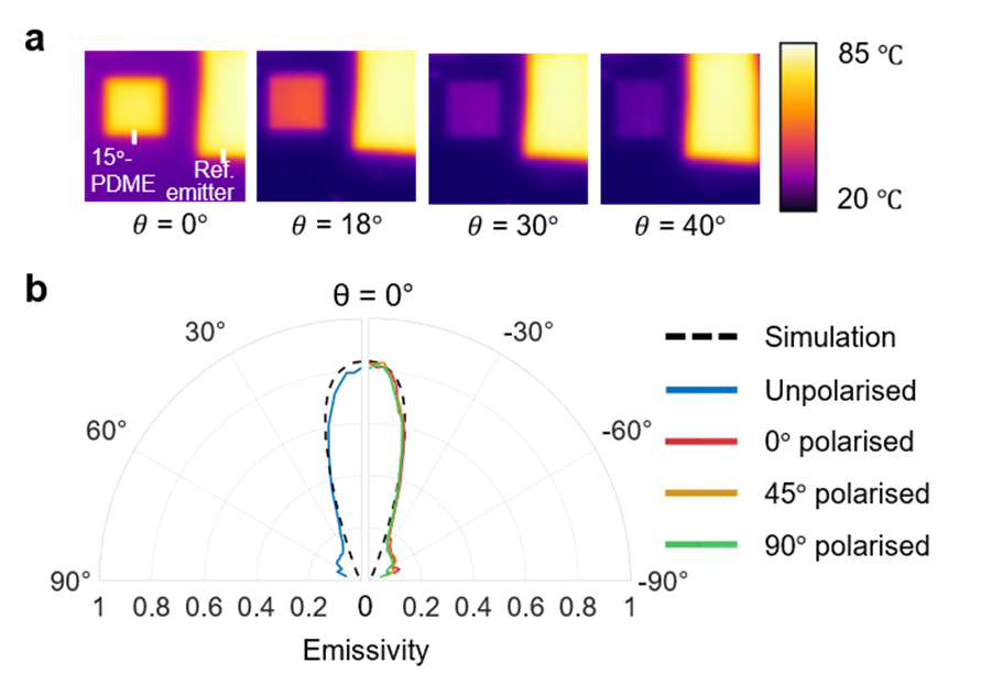 红外成像技术为该研究提供了更为直观的证据:随着观测角度的增加,定向发射器在红外图像中的亮度迅速下降,证明其具有显著的方向性。利用类似的方法,该团队拍摄了不同偏振方向下该发射器的红外图像,并发现其亮度基本不变,第一次实现了偏振无关的超宽带定向热辐射。