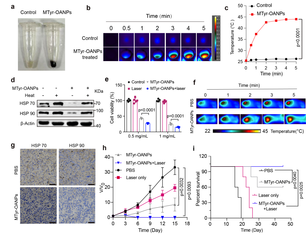 更令人惊喜的是,黑化的黑色素瘤细胞表现出对热应激的抵抗下降。而黑色素作为一种天然的光热试剂,具有优异的光热转化性能。在酪氨酸纳米胶束和近红外光的共同作用下,小鼠黑色素瘤在治疗第6天得到了根除,且在观察的49天内无复发。这说明,重新激活肿瘤代谢通路后在肿瘤内部大量积累的代谢产物和表型重塑,将有助于联合已有治疗手段实现协同抗癌(图6)。