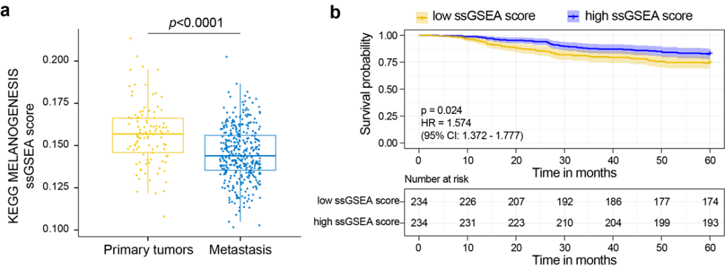 研究者们首先发现,肿瘤细胞中大多数受抑制的代谢途径,是肿瘤起源组织-细胞类型特异性代谢。例如,皮肤黑色素瘤(SKCM)起源黑色素细胞,合成及分泌黑色素是其重要的功能。而在晚期及转移性SKCM患者中,黑色素合成代谢通路显著下调(图1a),并且与患者生存期负相关(图1b)。