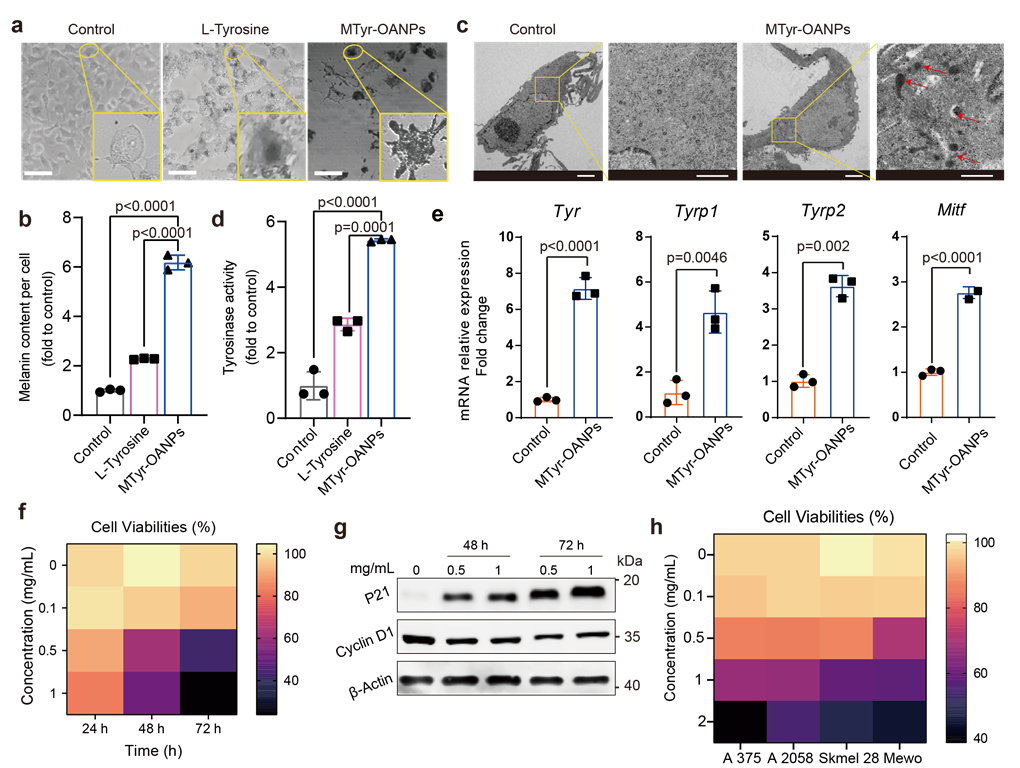 研究发现,酪氨酸纳米胶束通过提高黑色素合成相关酶的活性及表达、促进黑色素小体的合成等途径,激活了黑色素瘤细胞的黑素合成及分泌(较补充游离酪氨酸提高3倍左右)。与此同时,肿瘤细胞增殖也得到了显著抑制。