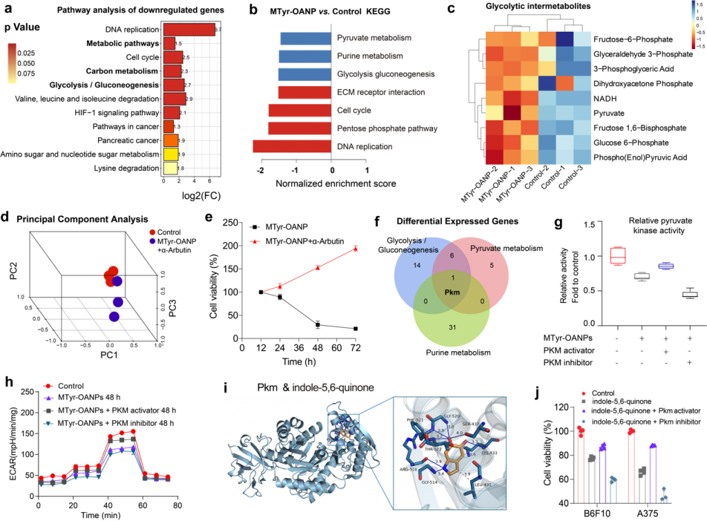 在机制方面,研究人员揭示:黑色素瘤的黑色素合成与糖酵解代谢之间存在相互作用。黑色合成的中间代谢产物5,6-吲哚醌,可以抑制糖酵解关键酶-丙酮酸脱氢酶(PKM)的活性,从而干扰肿瘤糖代谢抑制细胞增殖(图4)。