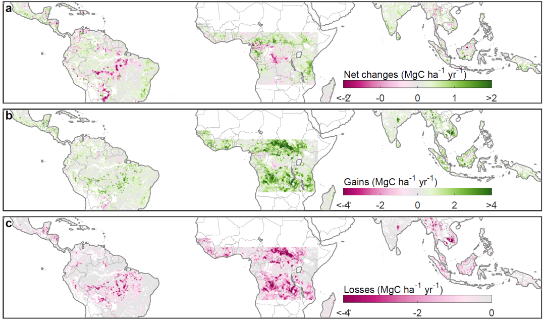 图1. 2010-2020年热带地区地上生物碳储量空间变化。a:净变化,b:增量,c:损失。