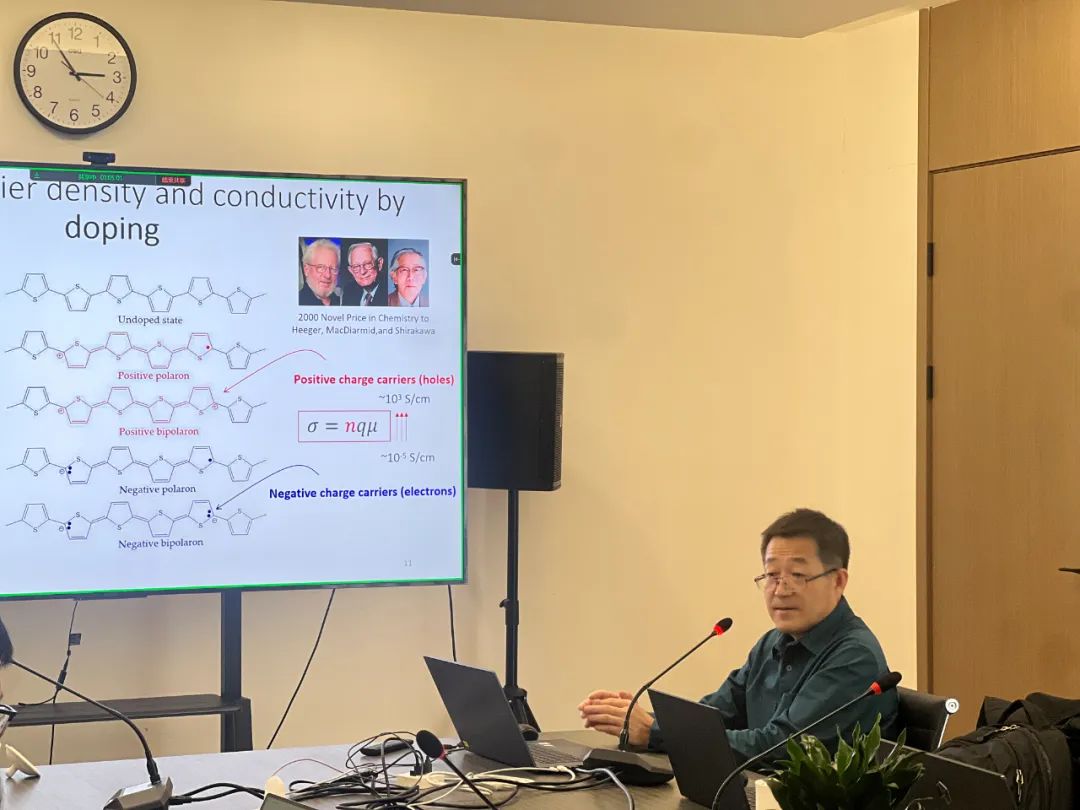 我校校长特别顾问祝京旭对李玉宁教授的到来表示热烈欢迎。李玉宁教授在讲座中重点介绍了应用于多种领域的传感器新型导电高分子设计。他从高分子导电的量子物理背景引入,详细阐述了VOC探测、温度传感器、NO₂检测、氟离子检测等不同的关键应用领域。在座师生围绕科学研究与应用实践的主题展开讨论,现场气氛热烈。