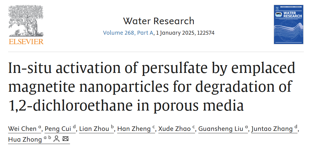 近日,我校钟华团队在水环境科学领域著名期刊《Water Research》发表题为“In-situ activation of persulfate by emplaced magnetite nanoparticles for degradation of 1,2-dichloroethane in porous media”的研究成果。团队开发了一种基于磁铁矿纳米颗粒(MNPs)的原位反应带激活过硫酸盐的方法,通过溶解性聚合物的强化迁移实现MNPs的原位布置并形成反应带,可有效且持续激活过硫酸盐,分解地下水中1,2-二氯乙烷等难降解性污染物。反应带连续工作9个月其性能不降低1,2-二氯乙烷的去除率稳定保持在50%左右,证实了其极强的持续性。研究还发现,与直接混合填充的四氧化三铁颗粒相比,MNPs因其微小粒径、高比表面积以及覆盖于介质颗粒表面的赋存状态,可更有效地激活过硫酸盐降解污染物。