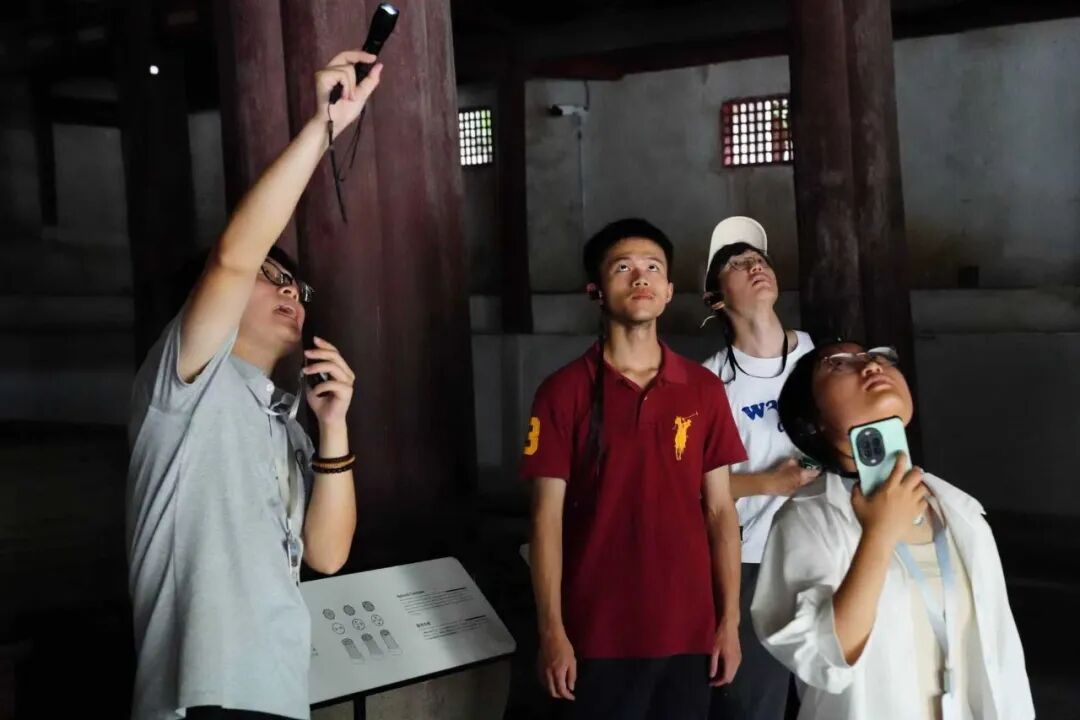 在讲解员的引导下,同学们仰观层叠出挑的斗拱,俯察严丝合缝的榫卯。当北宋《营造法式》中的“材分制”被对标为今日的“标准化生产”,思政课与科学精神实现了奇妙的同频共振。“技术标准就是古代的‘法’,更是今天的‘德’。”同学们在惊叹中感悟千年前的法治精神。