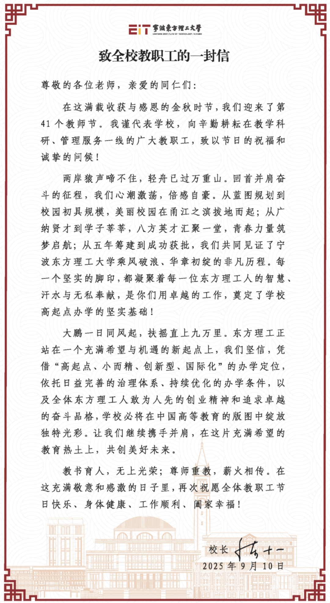 9月10日,陈十一校长向全体教职工发送了一封饱含深情的慰问信。