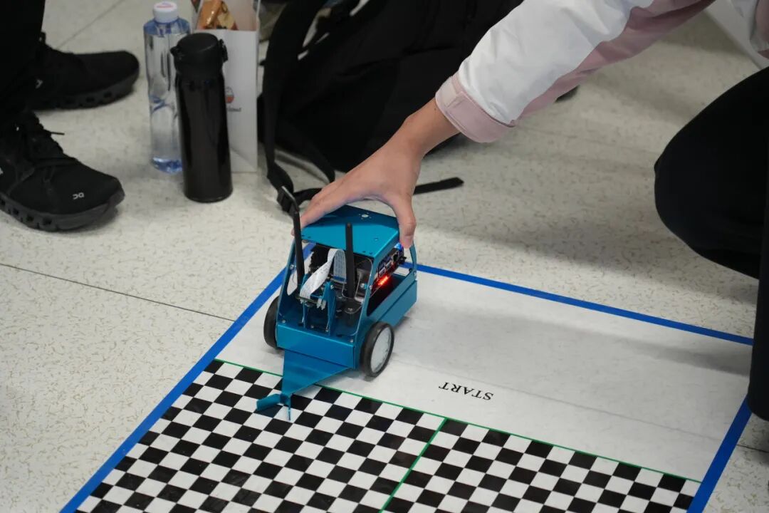 活动尾声,各小组更是展开了一场小小的“竞赛”,经过调试的小车同时运行,在规定时间、划定区域内实现智能避障。