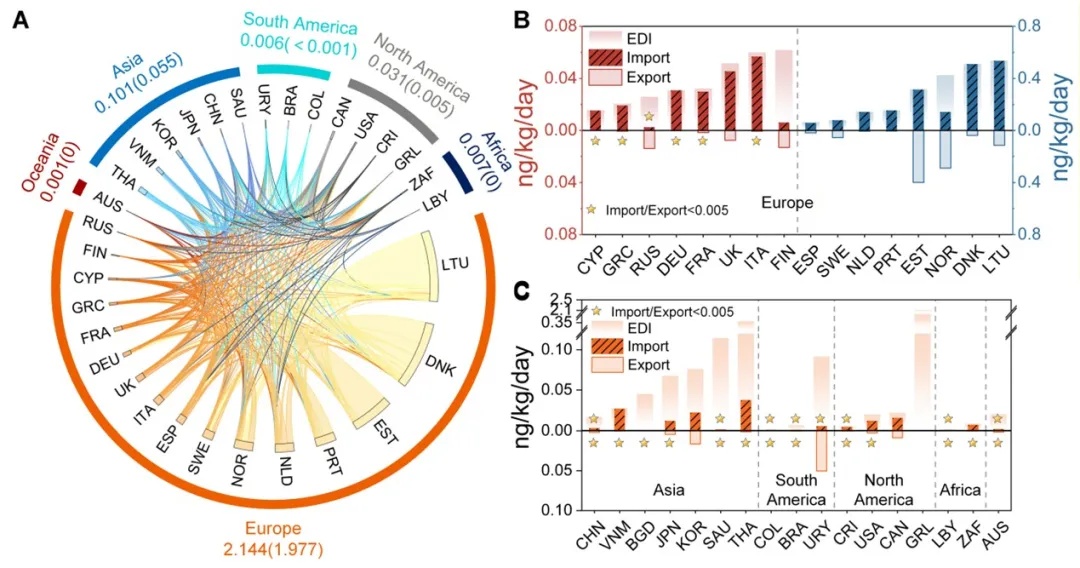 国际贸易改变各国C8-PFAS暴露量的具体路径(A)及国际贸易影响下的摄食海鱼造成的 C8-PFAS 预估每日摄入量(B和C)| 课题组供图