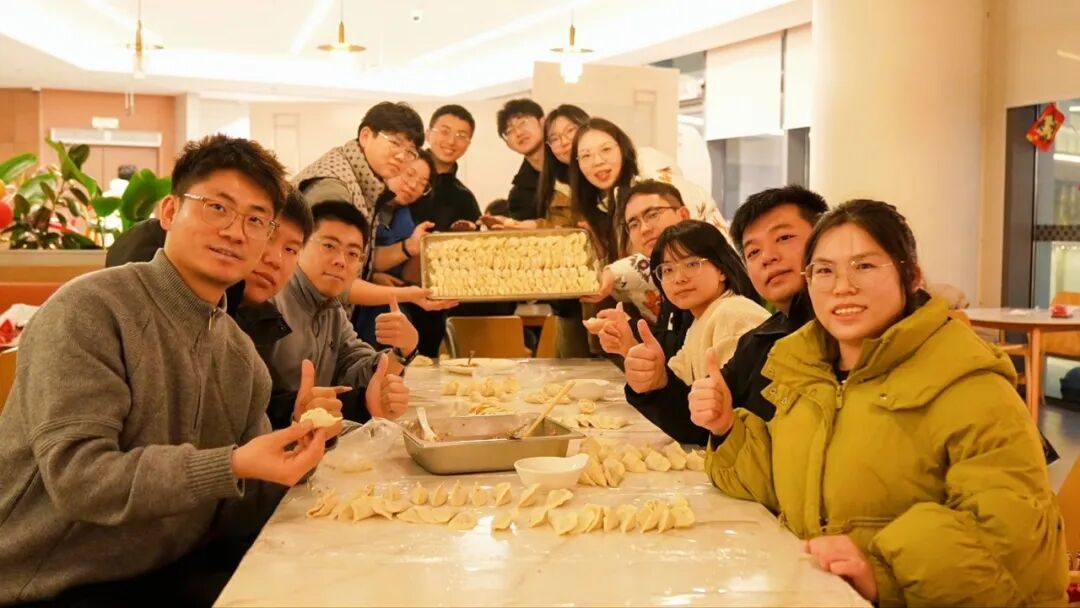 傍晚,食堂内切换到了“家宴”模式。擀皮、填馅、捏合、摆盘……一双双习惯了操作键盘、握持移液器的手,此刻共同包出了形态各异的“福气饺”。