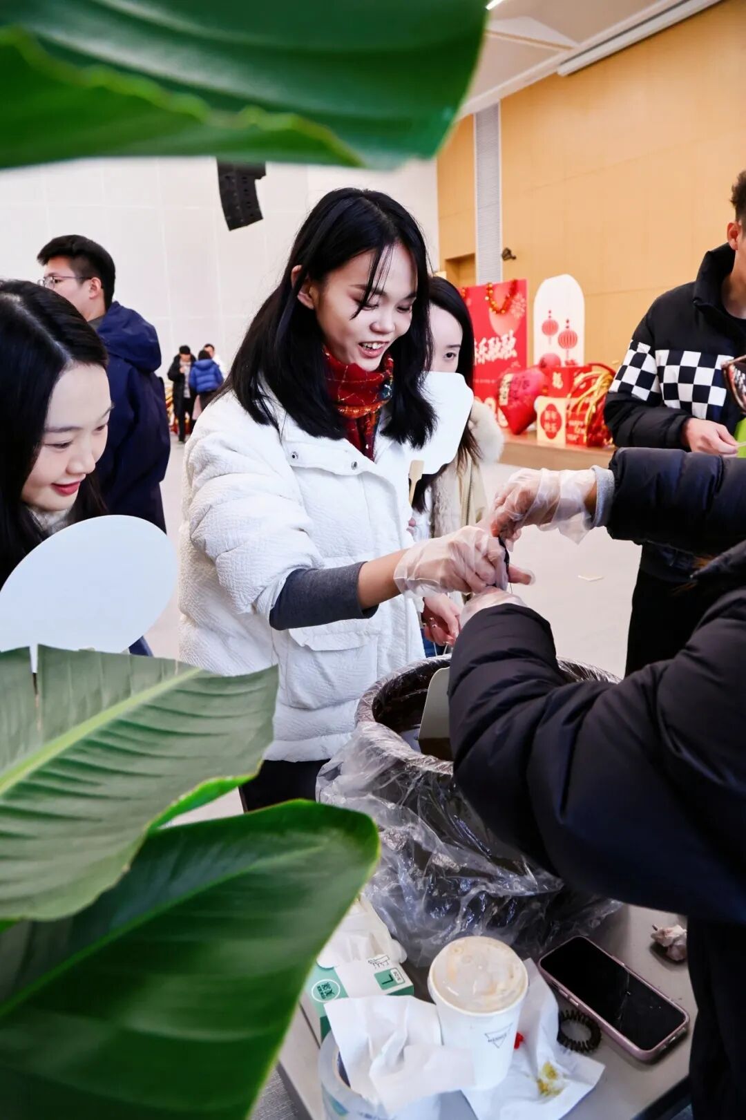 游园会现场,漆扇绘彩、糖葫芦制作、迎春写福、趣味投壶……六大摊位前人头攒动。