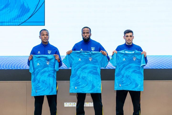 艾迪、莱昂纳多、奇塔迪尼(从左至右)展示新赛季主场球衣。宁波晚报供图