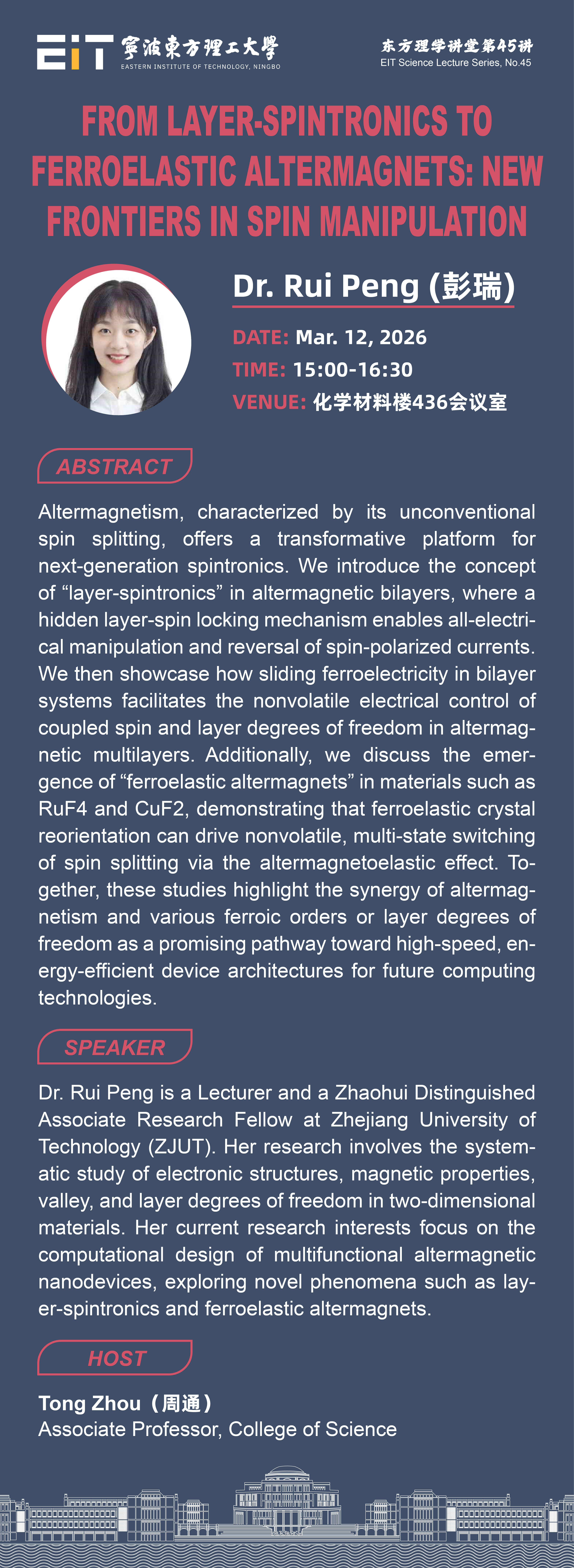 彭瑞 | 从层-自旋电子学到铁弹交错磁体:自旋调控的新前沿