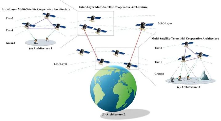 跨层协作:不同轨道高度的卫星(如低轨和中轨卫星)分工合作,低轨卫星负责接入,中轨卫星负责数据中转。