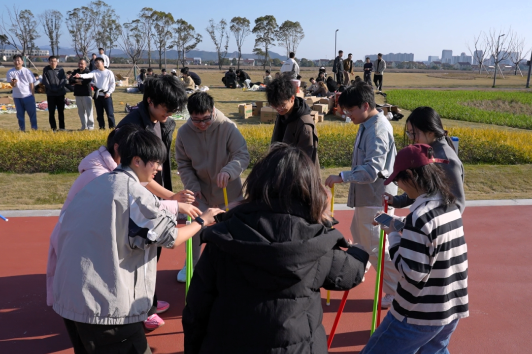草坪上,野餐垫依次铺开,师生们美食共享,闲话家常,春日的温柔与相聚的喜悦在此交融。趣味素拓环节的到来,更是让现场氛围持续升温。