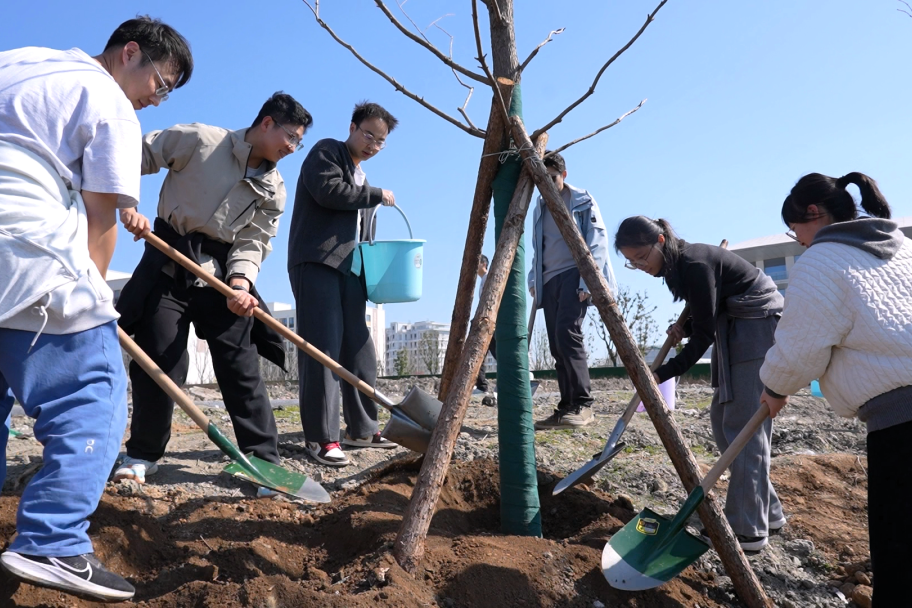 党委书记金波与师生党员、团员代表分为9个小组,挥锹铲土、栽种新苗,用双手为校园添新绿,用行动践行生态情。