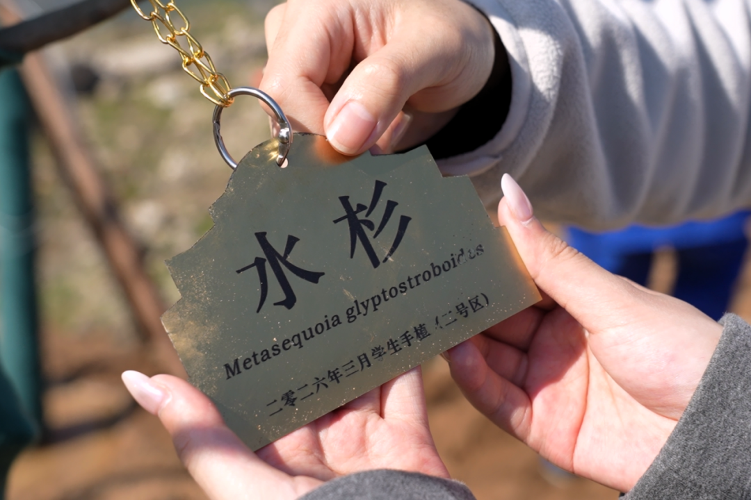 同学们为亲手栽种的小树苗挂上定制纪念牌,许下对未来的美好期许,有人说道:“多年后回母校,还要来看看我的树!”