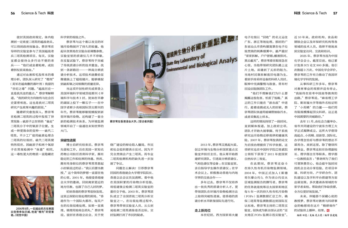 2013年,蔡宗苇又挑起大梁,创立环境与生物分析国家重点实验室并担任主任。他从零开始搭建研究团队,引进高分辨质谱仪、气相色谱仪等设备;在实验室里,亲自指导学生操作质谱仪;在学术会议上,积极推动香港与内地学界的交流合作……
