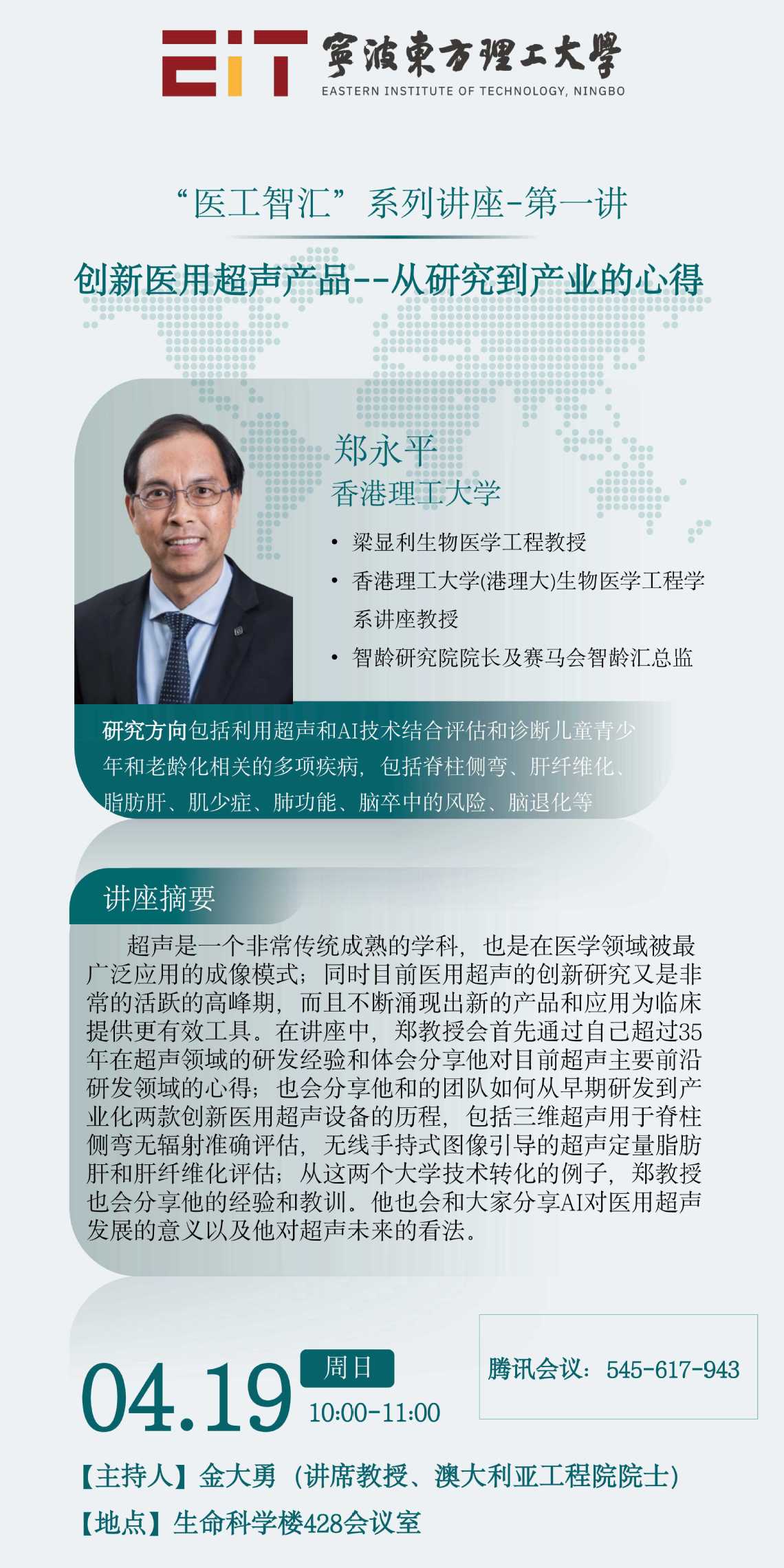 超声是一个非常传统成熟的学科,也是在医学领域被最广泛应用的成像模式;同时目前医用超声的创新研究又是非常的活跃的高峰期,而且不断涌现出新的产品和应用为临床提供更有效工具。在讲座中,郑教授会首先通过自己超过 35 年在超声领域的研发经验和体会分享他对目前超声主要前沿研发领域的心得;也会分享他和的团队如何从早期研发到产业化两款创新医用超声设备的历程,包括三维超声用于脊柱侧弯无辐射准确评估,无线手持式图像引导的超声定量脂肪肝和肝纤维化评估;从这两个大学技术转化的例子,郑教授也会分享他的经验和教训。他也会和大家分享 AI 对医用超声发展的意义以及他对超声未来的看法。