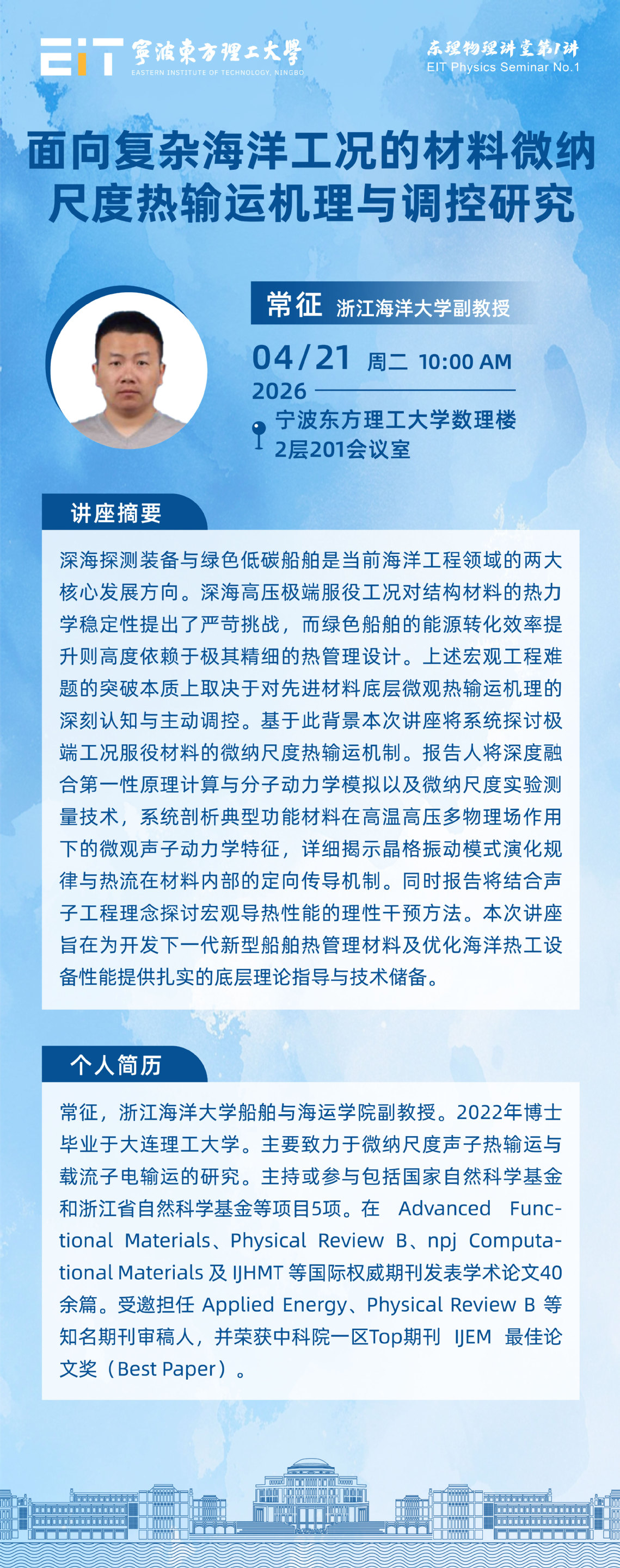 常征,浙江海洋大学船舶与海运学院副教授。2022 年博士毕业于大连理工大学。主要致力于微纳尺度声子热输运与载流子电输运的研究。主持或参与包括国家自然科学基金和浙江省自然科学基金等项目 5 项。在 Advanced Functional Materials、Physical Review B、npj Computational Materials 及 IJHMT 等国际权威期刊发表学术论文 40 余篇。受邀担任 Applied Energy、Physical Review B 等知名期刊审稿人,并荣获中科院一区 Top 期刊 IJEM 最佳论文奖(Best Paper)。