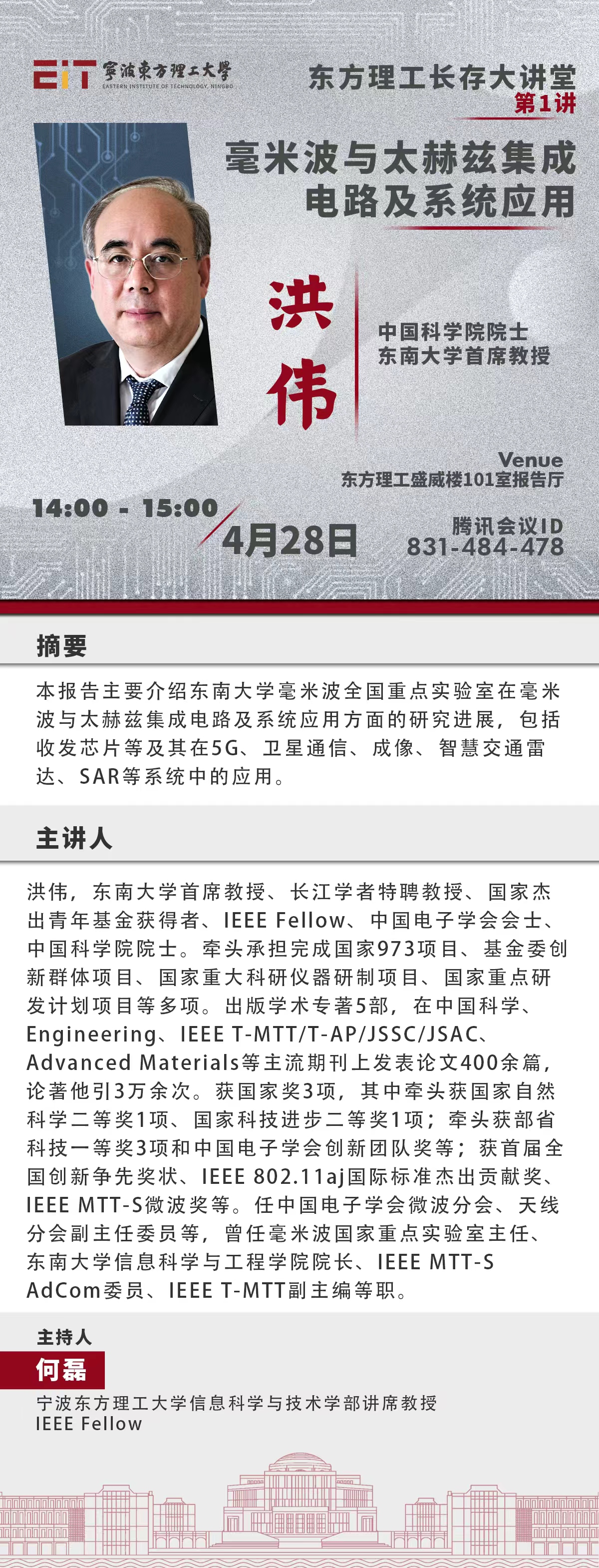 洪伟,东南大学首席教授、长江学者特聘教授、国家杰出青年基金获得者、IEEE Fellow、中国电子学会会士、中国科学院院士。牵头承担完成国家 973 项目、基金委创新群体项目、国家重大科研仪器研制项目、国家重点研发计划项目等多项。出版学术专著 5 部,在中国科学、Engineering、IEEE T-MTT/T-AP/JSSC/JSAC、Advanced Materials 等主流期刊上发表论文 400 余篇,论著他引 3 万余次。获国家奖 3 项,其中牵头获国家自然科学二等奖 1 项、国家科技进步二等奖 1 项;牵头获部省科技一等奖 3 项和中国电子学会创新团队奖等;获首届全国创新争先奖状、IEEE 802.11aj 国际标准杰出贡献奖、IEEE MTT-S 微波奖等。任中国电子学会微波分会、天线分会副主任委员等,曾任毫米波国家重点实验室主任、东南大学信息科学与工程学院院长、IEEE MTT-S AdCom 委员、IEEE T-MTT 副主编等职。