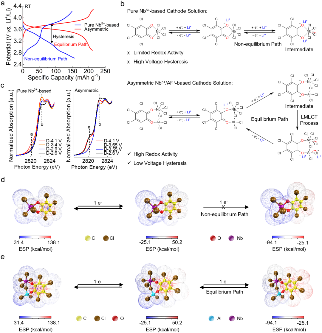The study found that as ions like Zr⁴⁺ gradually entered the organic phase, forming multi-center coordination with the C=O groups of o-TCBQ, it not only induced electron delocalization towards the inorganic Cl ligands but also significantly enhanced the molecular voltage and redox activity. Further introduction of Nb⁵⁺ and Al³⁺ to construct a heteronuclear, heteroleptic ASCSP structure activated a ligand-metal-ligand charge transfer mechanism. This breakthrough overcame the limitations of interrupted reduction and voltage hysteresis typical of conventional organic electrodes, achieving a high operating voltage of 3.6 V in the all-solid-state system, a significantly reduced voltage hysteresis (700 → 180 mV), and enhanced reversibility of the two-electron reaction (Fig. 2). Benefiting from the optimized solvation structure and the novel electron transfer mechanism, this solid cathode solution system not only possesses high voltage and fast kinetics but also exhibits exceptional long-cycle performance and rate capability even under low stack pressure. Importantly, owing to the low Young's modulus of o-TCBQ and the electrostatic interactions with the halide electrolyte, the material can adaptively embed into the electrolyte grain boundaries during charge/discharge processes, achieving crack repair and enhanced electrical contact, demonstrating self-healing interfacial characteristics.