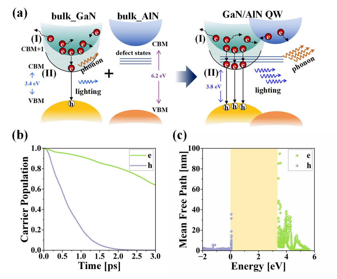 Based on their analysis of nitride band structures and carrier dynamics, the team led by Professor Suhuai Wei and researchers Zhiming Shi, Xiaojuan Sun, and Dabing Li pioneered the idea of enhancing the electron cooling rate by intentionally introducing and controlling nitrogen vacancy defects at the GaN/AlN quantum well interface. These defect states act as intermediate energy levels, significantly strengthening electron-phonon interactions and thereby accelerating electron cooling towards the conduction band minimum. First-principles calculations demonstrate that this strategy can shorten the electron cooling time by over an order of magnitude, effectively achieving a dynamic balance with the hole cooling rate and substantially boosting the luminescence efficiency. Compared to traditional EBL structures, this method enables precise control of electron dynamics without the need for complex additional layer design. This research also expands the boundaries of semiconductor defect physics, systematically validating the "beneficial" role defects can play in tuning device performance, challenging the conventional view of defects as purely detrimental. It provides crucial theoretical support and new design principles for defect engineering in next-generation electronic and optoelectronic devices.