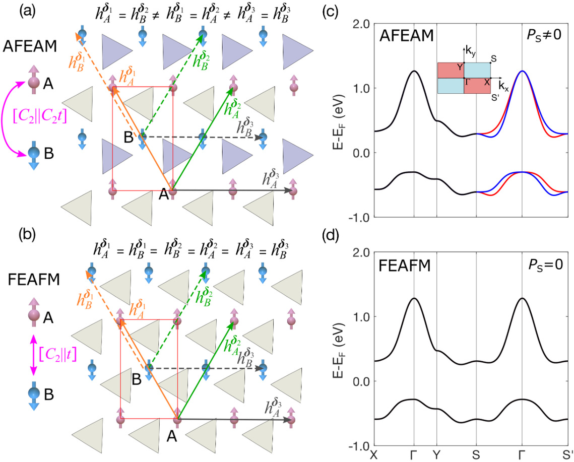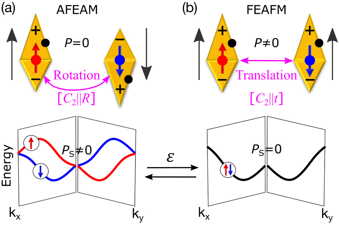 In this study, based on symmetry analysis, Professor Tong Zhou's team proposed a universal design principle: when the opposite-spin sublattices in an antiferromagnetic order are related by rotational symmetry, the system exhibits altermagnetism and can generate spin polarization; when they are connected directly by translational symmetry or spatial inversion symmetry, the system is a conventional antiferromagnet without spin polarization. The antiferroelectric state often involves rotational symmetry (e.g., a 180° rotation), which can promote an altermagnetic coupling between the sublattices, endowing the system with spin polarization. In contrast, the ferroelectric state typically involves translational symmetry, causing the system to revert to a conventional antiferromagnet without spin polarization. Since the antiferroelectric and ferroelectric states can be switched by an external electric field, this allows for electric-field control over the magnetic type and the presence or absence of spin polarization. Furthermore, reversing the direction of all local polarizations in the antiferroelectric state can flip the spin polarization without altering the underlying magnetic order.