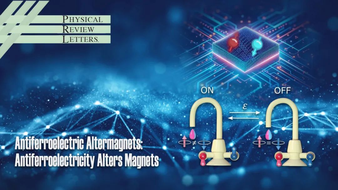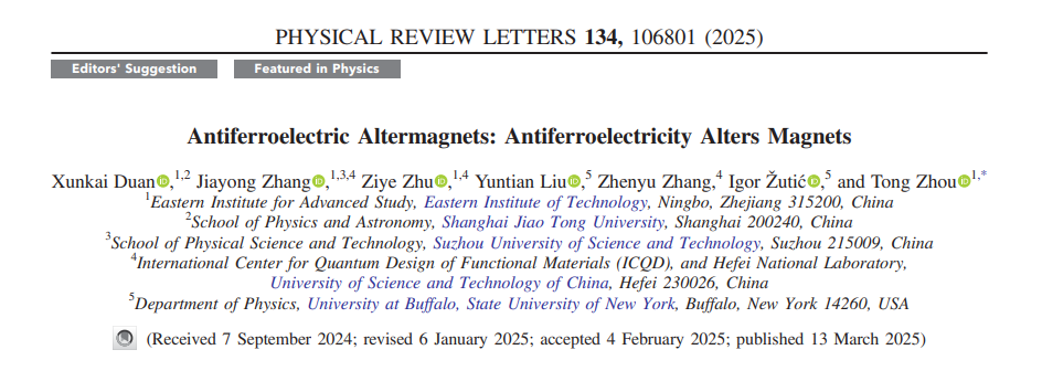Recently, the research team led by Associate Professor Tong Zhou at Eastern Institute of Technology, Ningbo, has achieved a major breakthrough in the fields of multiferroics and spintronics. For the first time, the team proposed a novel class of multiferroic systems—antiferroelectric altermagnets (AFEAM)—and demonstrated highly efficient electric-field control of magnetic order and spin polarization based on this platform. This work, entitled "Antiferroelectric Altermagnets: Antiferroelectricity Alters Magnets", has been published in the prestigious physics journal Physical Review Letters (PRL). Recognized for its high significance and novelty, the paper was selected as an Editors' Suggestion and featured prominently on the PRL homepage. Additionally, the research was highlighted by Physics, a scientific journal of the American Physical Society (APS), in a report titled "Altermagnets that Turn On and Off".