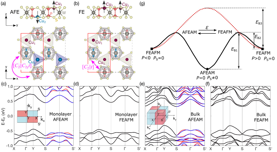 Material Realization: Regarding how to realize antiferroelectric altermagnets in real materials, the research team conducted a systematic exploration from three-dimensional (3D) to two-dimensional (2D) systems, and from transition metal oxides to van der Waals (vdW) materials. Using first-principles calculations, they identified a series of highly promising candidate materials, many of which have already been synthesized experimentally. For instance: In 3D systems, numerous transition metal oxides in their antiferroelectric-antiferromagnetic states, such as BiCrO₃, BiCoO₃, BiFeO₃, and SrCrO₃. In 2D systems, members of the van der Waals thiophosphate/selenophosphate family (e.g., CuMP₂X₆ where M=W, Mo, etc., and X=S, Se) were found to maintain their antiferroelectric altermagnetic characteristics from the monolayer to bulk forms. These diverse material systems provide a solid foundation for subsequent experimental verification and device fabrication.