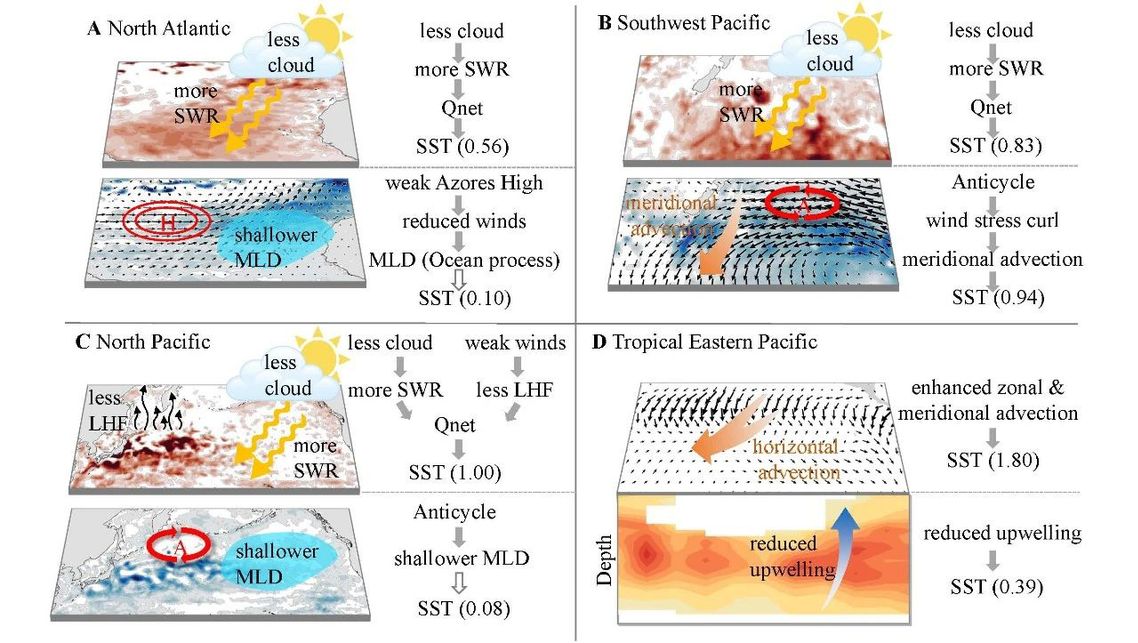 Southwest Pacific: An atmospheric anticyclone in this region caused strengthened easterlies and weakened westerlies, enhancing meridional ocean heat transport. Concurrently, reduced cloud cover allowed more solar radiation into the ocean, exacerbating sea surface warming.