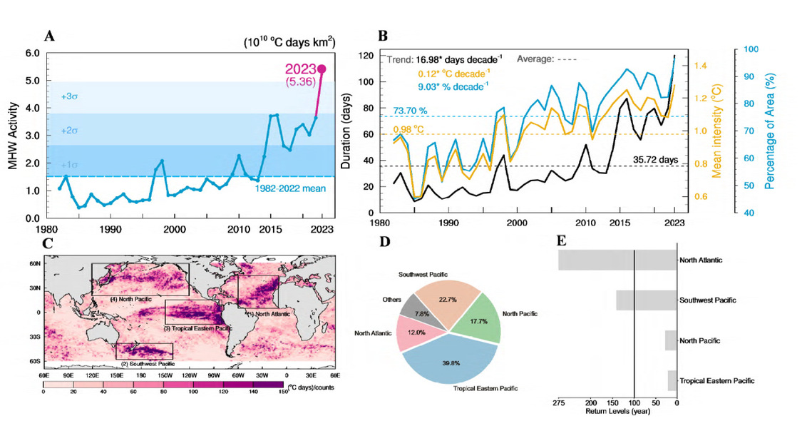 Against the backdrop of anomalous global ocean warming, extreme MHWs became a focal point of climate research, attracting significant international attention regarding their formation mechanisms and potential impacts. The latest research by Professor Dongxiao Zhang's team from Eastern Institute of Technology, Ningbo, published in Science, shows that the total cumulative MHW intensity in 2023 reached 5.36×1010 ℃ days km2, exceeding three standard deviations above the climatological mean and setting the most extreme annual level on record. Specifically, the North Atlantic and the Southwest Pacific experienced extreme events estimated to occur once every 276 years and 141 years, respectively, far surpassing historical counterparts in intensity and duration. Globally, the average duration of MHWs in 2023 was 120 days, extending up to 525 days at maximum, with an average intensity of 1.3°C. The area affected by MHWs exceeded 96%, significantly higher than the average over the past 40 years.