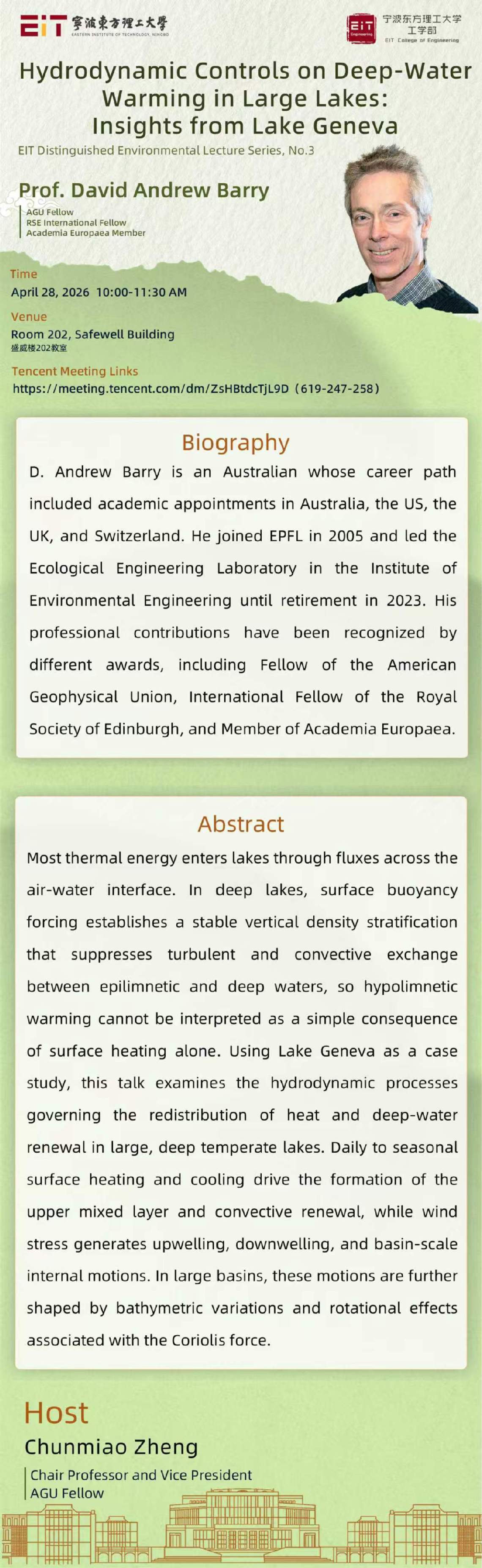 Lecture Series | David Andrew Barry: Hydrodynamic Controls on Deep-Water Warming in Large Lakes: Insights from Lake Geneva